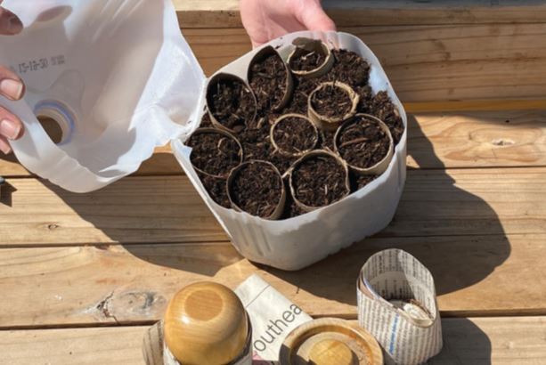 Make transplanting easier by using the cardboard tubes from toilet paper to help space winter sown seedlings. Cut the toilet paper cardboard tubes to the right height and set them in the milk jug. Fill the bottom of the milk jug with potting mix and plant the seeds. Otherwise, plan on doing some careful separating of the individual seedlings in each milk jug or soda bottle.